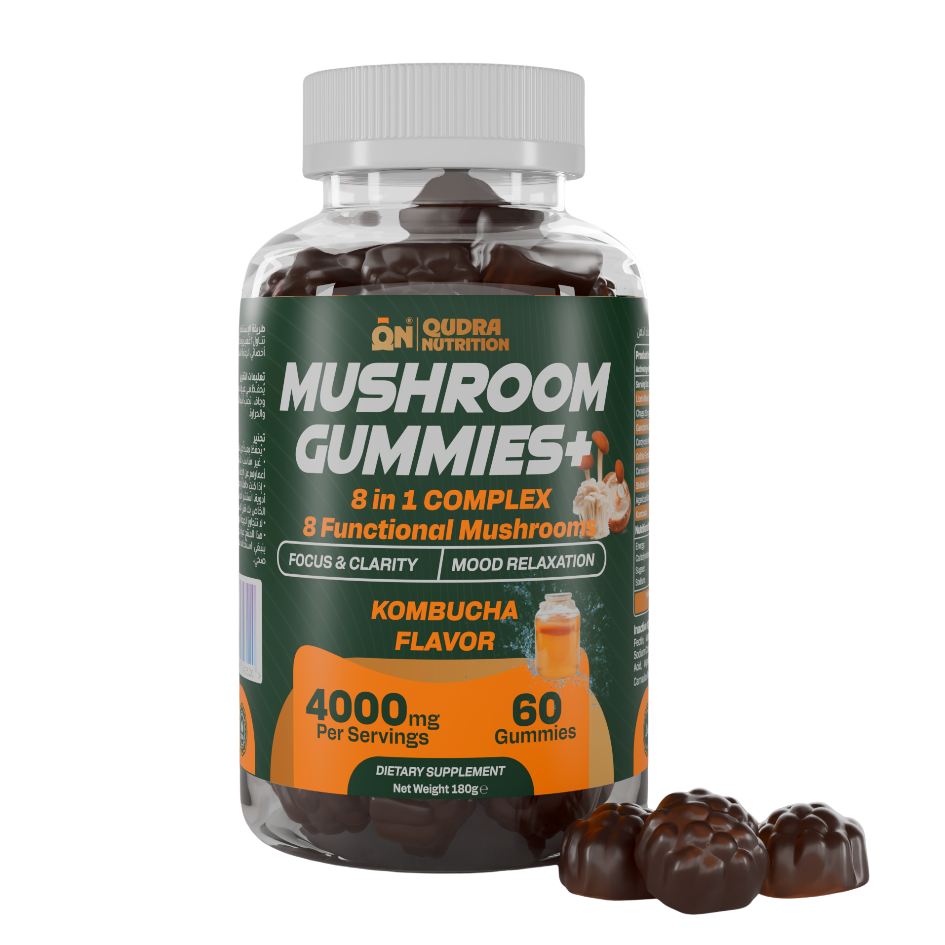 Qudra Nutrition Mushroom Gummies Plus is a dietary supplement formulated with an 8 in 1 functional mushroom complex combined with kombucha. Each serving delivers a balanced blend of carefully selected mushroom extracts to support focus, clarity, mood relaxation, and overall daily wellness.